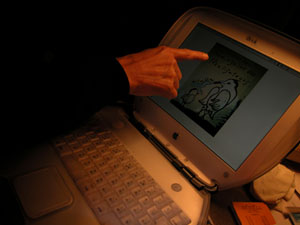 | 2月(04年)にパリに行った時、大月雄二郎に会った。 彼と会うのは、昨年の東急文化村ギャラリーでの 彼の個展以来だから、一年ぶりだ。 その時は3次会くらいで 新宿ゴールデン街のとあるバーに流れ着いたのだけれど、 同席したのがあの憧れの山口小夜子様で、 ふとオカルティズムの領域に話題は向かい、 つっこまれて知ったかぶりの返事で濁したのだけど、 優しく対応してくれたっけ。 今回、大月雄二郎のアトリエを訪問すると、 今年のカンヌ映画祭の監督週間のポスターとして 採用された彼の作品をi-Bookで見せてくれた。 彼は何故かパリでは、パゾリーニ映画賞の審査員なんかを やっていて、日本では、映画を作る話も進んでいるらしい。 この贅沢な不良の作る映画を早く観てみたいものだ。 |