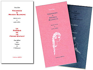 ウニカ・チュルン遺稿集 メゾン・ブランシュでの休暇澁澤龍彦ベルメール論集成 ファンム・アンファンの楽園 ウニカ・チュルン遺稿集 ウニカ・チュルン著 宮川尚理編・訳 / 87P 澁澤龍彦ベルメール論集成 澁澤龍彦著 岡田邦雄編 / 91P ガレリア・アミカ 発行 間奈美子(アトリエ空中線) 造本 220mm x 115mm / Paperback / 2冊組本 定価4800円 2001年に発行された限定80部のウニカ・チュルンとハンス・ベルメールの特装函の『メゾン・ブランシュでの休暇』と『ファンム・アンファンの楽園』2冊を新たにセットし発行。2冊組本のため筒箱が用意され、特装函では二つ折りカードで入っていた四谷シモンによるベルメールへのオマージュ「聖なる粘液」が今回筒箱の裏表紙に印刷されている。『ファンム・アンファンの楽園』は澁澤龍彦の著作の中からベルメール論を一冊にまとめたもの。『メゾン・ブランシュでの休暇』のほうはウニカの最後の年となる1970年にメゾン・ブランシュその他の精神病院での生活の中で書かれたもので、本書で初めて翻訳された貴重な一冊。 |